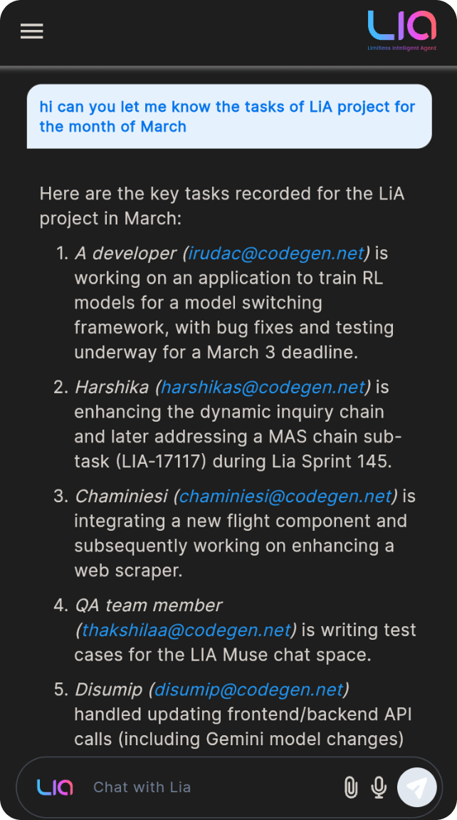 LIA Agile is your AI-powered project assistant, seamlessly integrating with JIRA and other tools while staying accessible on Google Chat, Slack, and our web and mobile app. Enjoy real-time tracking, automated updates, and effortless collaboration with no more platform switching